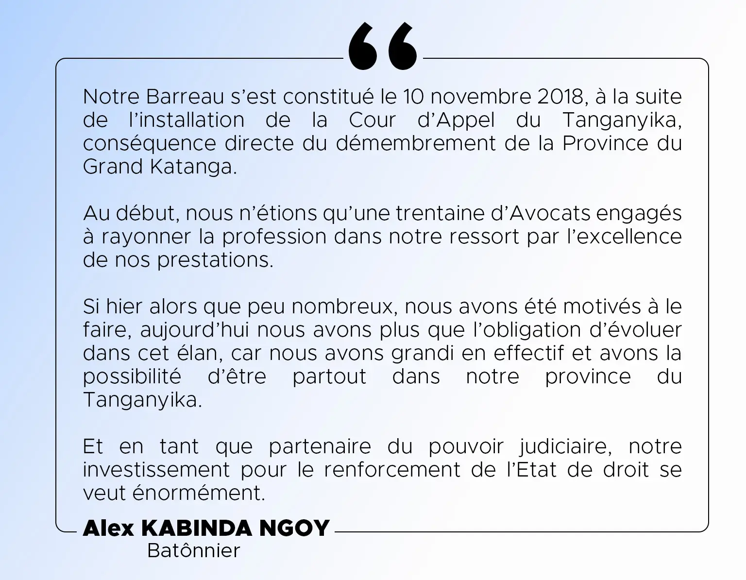 Le Barreau du Tanganyika a été créé le 10 novembre 2018 avec 36 Avocats, à la suite de l’installation de Cour d’Appel du Tanganyika.